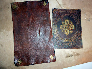 Cut a piece of leather (I used artificial leather which was sanded and distressed to make it look old and more real). Emboss the edges with a stamp and golden embossing powder. Glue on front book cover.